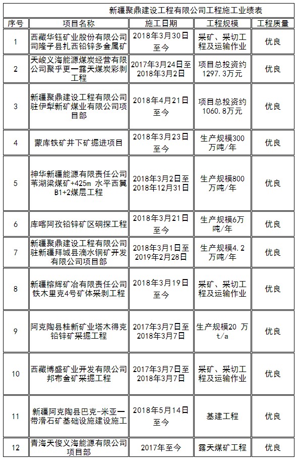 新疆聚鼎建設(shè)工程有限公司為國(guó)家礦山工程總承包二級(jí)企業(yè),創(chuàng)建于2013年,主要從事礦山采掘、隧道開(kāi)挖、大型土石方爆破、機(jī)電設(shè)備安裝,水利水電工程,路橋工程等工程施工。